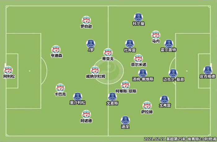 基于当年率领那不勒斯造访安菲尔德时的经验,安切洛蒂在2020/21赛季次回合默西塞德德比中再次使用三中卫/五后卫阵型。迈克尔-基恩身边是机动性很强的霍尔盖特和戈弗雷,有效地封锁住了肋部空间。彼时刚刚伤愈的勒温和阿兰被留作后手,安切洛蒂让里沙利松突前,汤姆-戴维斯协助安德烈-戈麦斯出球,掩护J罗和迪涅插上助攻。