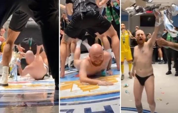 从视频来看,布兰登-阿什顿只穿着内裤和袜子,在曼城球员们的列队欢呼中,踏入更衣室,来了一个鱼跃俯冲滑行!拿下冠军,就是这么嗨!