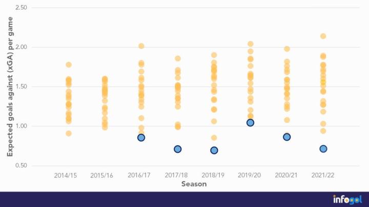 他们将每场比赛的预期失球数限制在0.72个,这是一个隐藏自己的防守弱点,以维持对比赛完全掌控的体系的典型特征。
