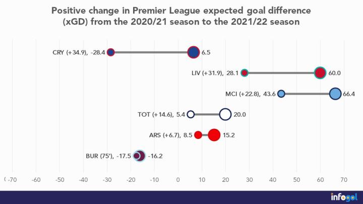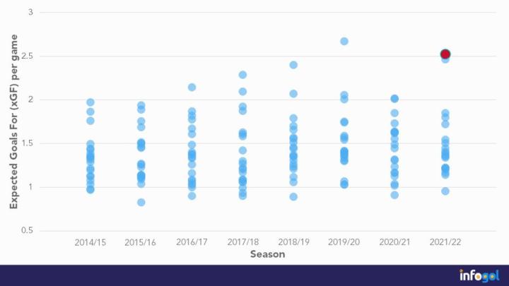 本赛季场均预期进球数高达2.52,仅次于19/20赛季的曼城。可惜本赛季克洛普的球队只能屈居亚军。