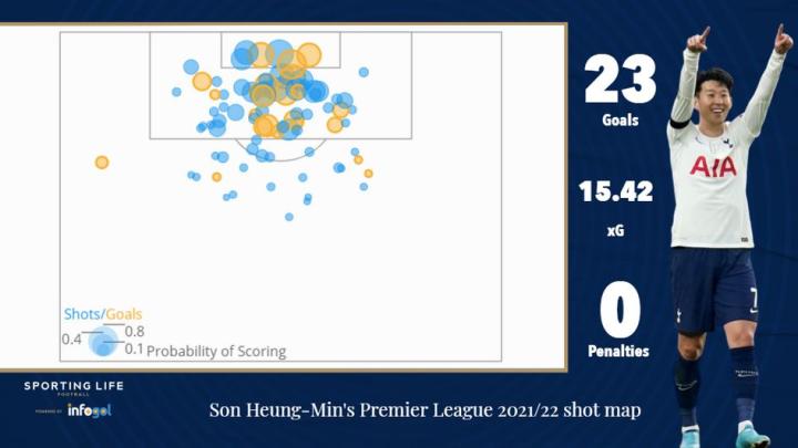 在和埃及人的激烈竞争中,孙兴慜和萨拉赫最终一起分享了金靴。本赛季他打进了令人印象深刻的23个进球(0个点球)——比他总共的15.42个预期进球还高出了7.58个。