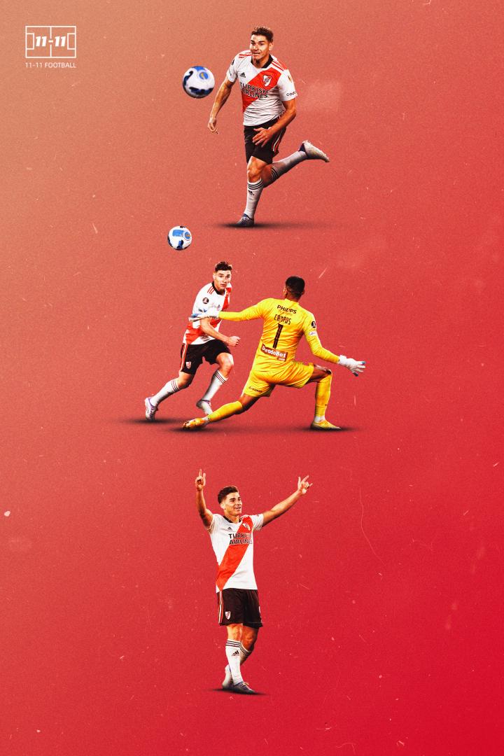 11-11足球原创//球星海报系列 南美解放者杯小组赛F组,来自阿根廷的河床队以8比1的比分大胜来自秘鲁的利马联盟。此役,球队的00后前锋胡利安·阿尔瓦雷斯大演进球好戏,一人在比赛中独进6球。凭借这次双份的帽子戏法,赛后他也带走了两个比赛用球作为纪念。 此役后,阿尔瓦雷斯成为河床队史第一位单场打进6球的球员;在南美解放者杯的历史上,在阿尔瓦雷斯之前完成这一成就的,也只有1985年效力于玻利维亚绽放俱乐部的胡安·卡洛斯·桑切斯。 阿尔瓦雷斯今年22岁,年轻的他已经在阿根廷国家队登场6次(其中首发1次)。在阿根廷队最近一场对阵厄瓜多尔的世预赛中,阿尔瓦雷斯完成了国家队首次首发和首粒进球的里程碑。这位年轻人已经在冬窗被曼城签下,并回租给河床队。今年7月,他将正式加盟曼城,在瓜迪奥拉帐下听用。