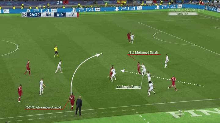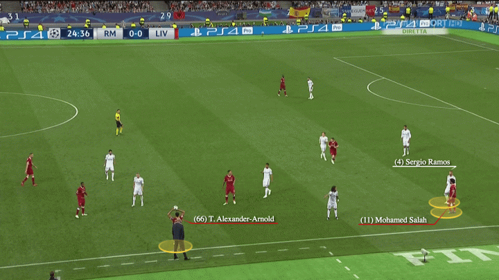阿诺德掷了一个超远的界外球,而拉莫斯从比赛的一开始就一直在盯防萨拉赫,当埃及人飞奔着去接阿诺德的球时,他也跟了上去。