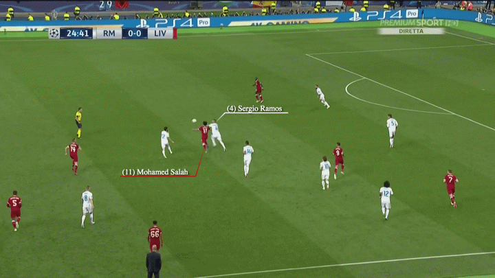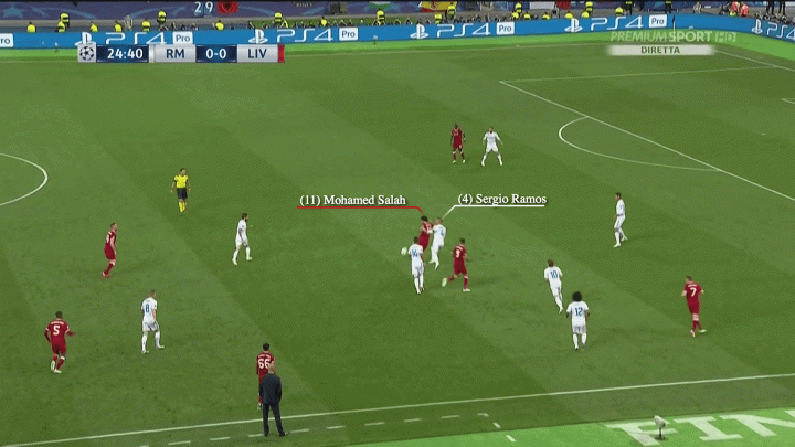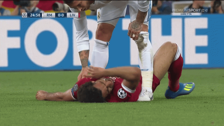 拉莫斯曾试图抓住萨拉赫的肩膀,但无法完全控制住他,于是在他第二次尝试这么做时,他将萨拉赫的右臂锁在了他的左臂下面,随后两人一起滚到了地上,萨拉赫在下落的过程中转了一圈,左肩着地,而拉莫斯落地时还有缓冲,他摔在了萨拉赫的身上,这也导致了冲突的产生。