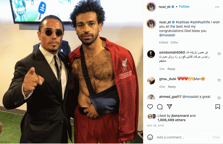 努斯雷特·戈克切,也就是大家俗称的“撒盐哥”,像秃鹫一样在周围闲逛,并且在比赛结束之后与明显还在生气的萨拉赫搭讪合影。这位著名的烤肉厨子噘着嘴,指着相机,而萨拉赫站在那里,看起来很茫然。他的肩膀上披着一件利物浦的运动服,下面只穿了一条短裤。撒盐哥还在比赛结束之后与拉莫斯、C罗、马塞洛还有贝尔合了影。