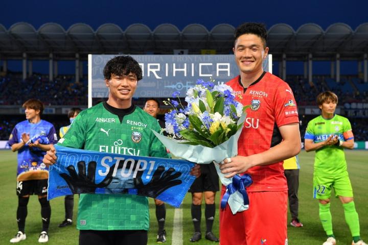 赛前,川崎为韩国门将郑成龙举办了简单的J1第200场的庆祝仪式,颁奖嘉宾则是效力于凯尔特人的川崎旧将旗手怜央。
