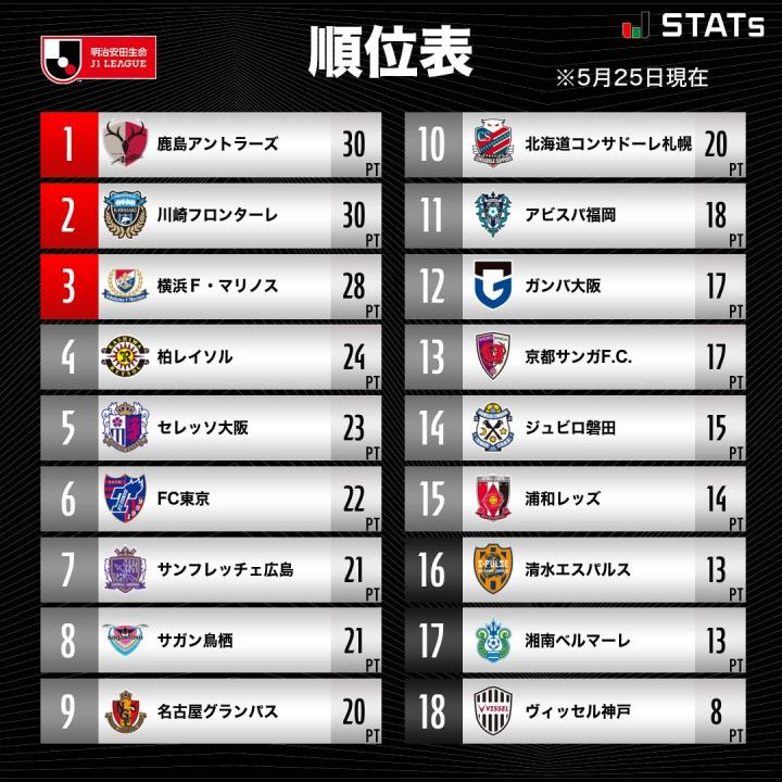北京时间5月25日,J1联赛第14轮的大部分比赛结束。鹿岛鹿角和鸟栖砂岩上演补时“神剧本”,4-4战平,樋口雄太和小泉庆各自战旧主时表现抢眼;川崎前锋主场0-4惨败湘南比马,输掉“神奈川德比”的同时丢掉榜首,町野修斗连场双响;柏太阳神客场6-1大胜十人北海道札幌冈萨多,森海渡双响;伊涅斯塔J1百场里程碑,神户胜利船0-0战平磐田喜悦,继续联赛垫底。