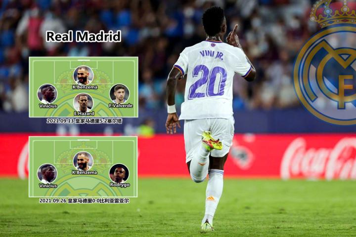 (图)赛季初,安切洛蒂增设前腰(阿扎尔&阿森西奥)来支援锋线,回归433后,莫德里奇、克罗斯和本泽马会同时出现在一块区域组织进攻,维尼修斯是受益者。