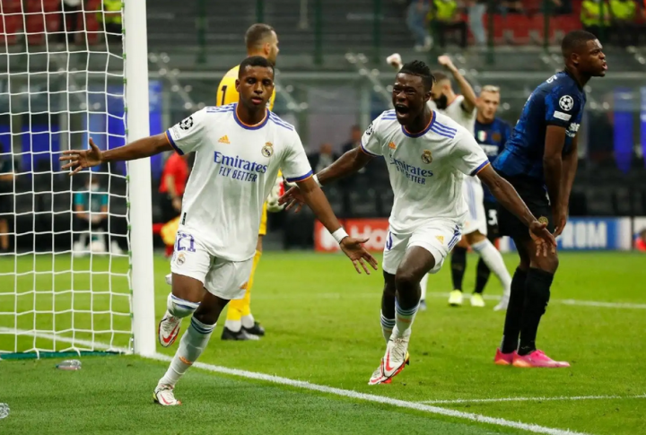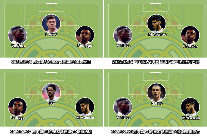 接下来,安切洛蒂又多次使用非对称中场架构,即一侧由翼类球员担当(维尼修斯&巴斯克斯),一侧由边中场驻扎(F.巴尔韦德和莫德里奇),这种部署在面对使用四后卫体系的对手时游刃有余,面对拥有两名翼卫的球队时就会显得覆盖能力不足,这在对阵国际米兰的首回合较量中体现地非常明显。随着阿扎尔和贝尔的受伤,阿森西奥回到锋线轮换体系中,又经历了对阵蒂拉斯波尔警长和西班牙人的两连败,安切洛蒂不得不忍痛搁置442体系,重启433阵型。