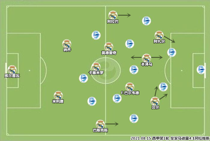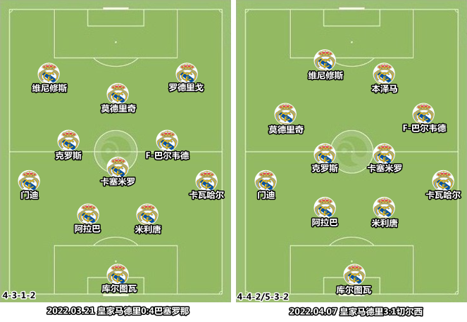 在对阵格拉斯哥流浪者和AC米兰的热身赛中,安切洛蒂摆出四中场+双前锋,即442切换433。随后,表示“本泽马太全面,‘前锋’不足以来定义他”,同时强调了贝尔和阿扎尔的价值,已经习惯打中卫的阿拉巴回到了左后卫位置。安切洛蒂以实际意义上的“无翼”布局释放了边卫的助攻潜力,同时在中路构建了密集的传控网络,这套433切换4312的模式与当年22连胜期间的4222有异曲同工之妙。
