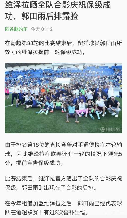 葡超新贵维泽拉(Vizela)俱乐部牛!五年来连续两年冲甲失败,但是这支有83年历史的葡萄牙小镇球队却韧劲十足,最近三年连升三级,升至葡超。今年在首个赛季,倒数第二轮联赛中主场顽强保级。这支小球队是一支普通而典型的欧洲足球小球会,也折射出了欧洲足球深蕴的文化和历史:1.整个小镇人口不足两万人,却能支撑其升至顶级联赛的行列。2.球队尽管连续两年冲甲失利,坚持五年未换主教练,换来的是球队最终冲到葡超,并在首赛季成功保级。3.球队生存之道是每年由其体育总监从非洲国家和葡萄牙国内引进优秀年轻球员,进行培养然后再转会给豪门球队换取利润来支持球队的运营。4.郭田雨的加盟,体现了欧洲职业足球的操守。希望国内俱乐部能从Vizela汲取经验和获得启示。