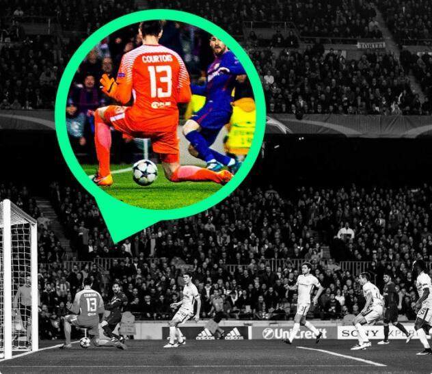 在当赛季的欧冠1/8决赛次回合,切尔西客场对战巴塞罗那之战中,开场仅128秒,梅西的小角度低射,直接从库尔图瓦的双腿间穿过,随后梅西助攻登贝莱破门后,又在第63分钟故伎重演,球再次从比利时人的两腿之间滚入,这也是梅西欧冠的第100球。