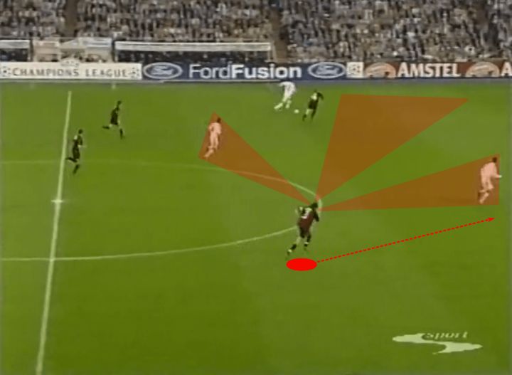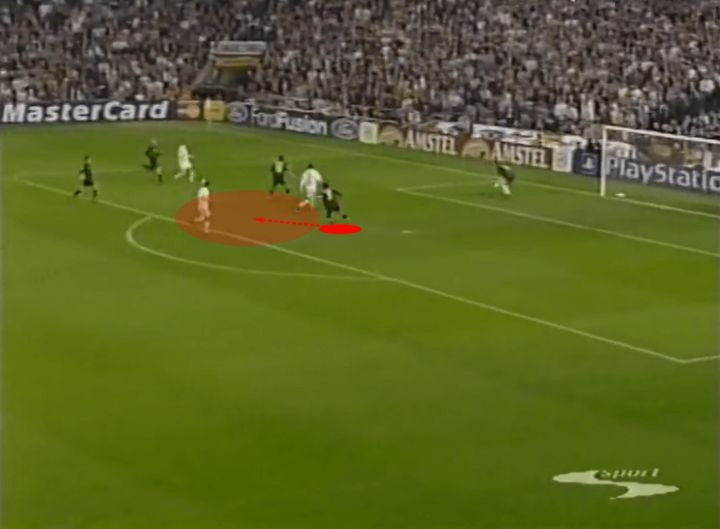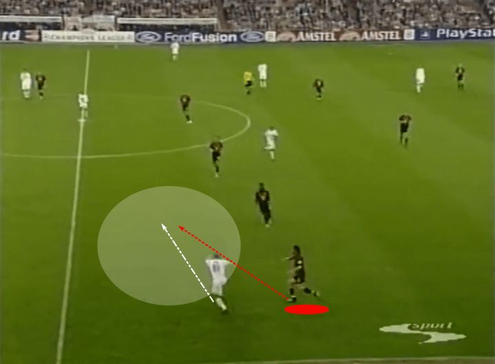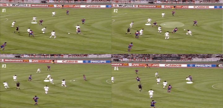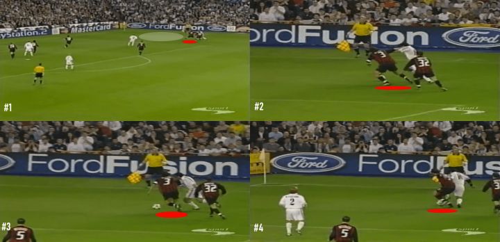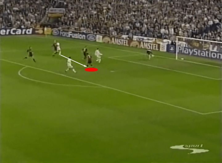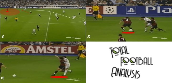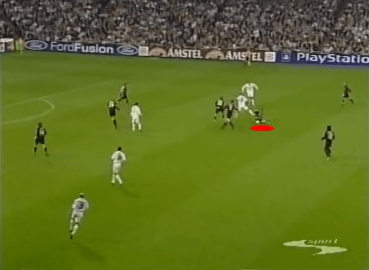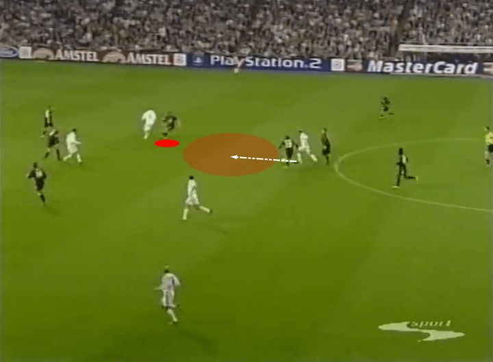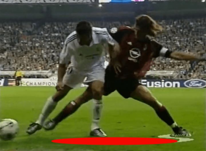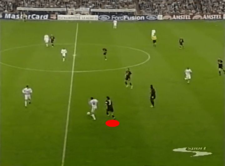 虽然我们不会特别关注铲球,但实际上这正是我们的第一个例子。让我们看下面的截图,注意马尔蒂尼和他的对手一起奔跑,齐达内试图带球穿过米兰中场。他一路上都在和对手缠斗,所以马尔蒂尼正在寻找一次过重的触球来提示他上抢。
