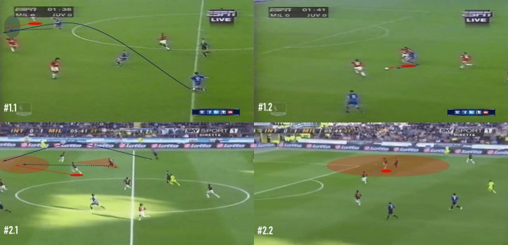 下方的两张图显示了米兰角球后的情况。当马尔蒂尼回到他的位置时,他发现了对手的提前跑动。他没有等待对方确认长传,而是直接跟人回撤。他的对手再一次拥有了明显的速度优势,但马尔蒂尼对对手跑动的意识和对最坏情况的预判让他夺回了球权。