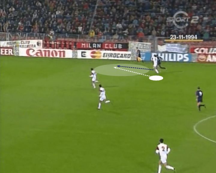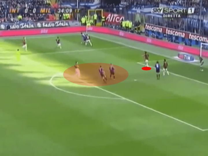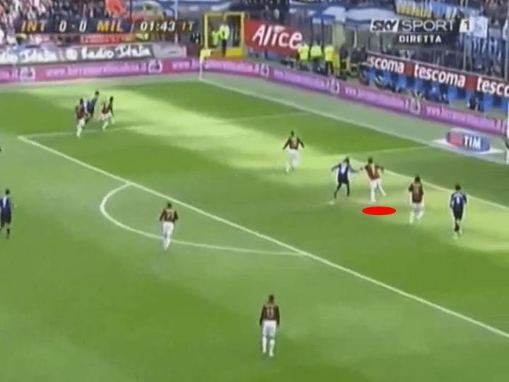 当其他六名球员仍在朝着米兰的球门奔跑时,马尔蒂尼向球跑去,轻松拦截下来。这里的一个关键是马尔蒂尼能够很快回到到一个优势位置,当他跟随对方最接近球门的球员时,他让自己能够随时作出改变。通过回到防守位置,他避免了混乱的跑位和封堵射门的必要性。相反,他更深入的站位使他能够放慢回追的速度,发现身后插上的对手,并预判对手的传中。