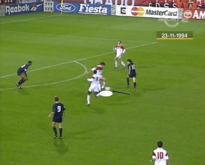我们再次在这里看到整个过程中手臂和上身的使用。内侧手臂和手用来延缓对手的行动,然后他可以将身体阻拦在对手和球之间。在建立起身体屏障后,他的对手,阿贾克斯的乔治·菲尼迪只能拉拽对手并犯规。这是通过身体对抗来抵消速度劣势的大师级课程。