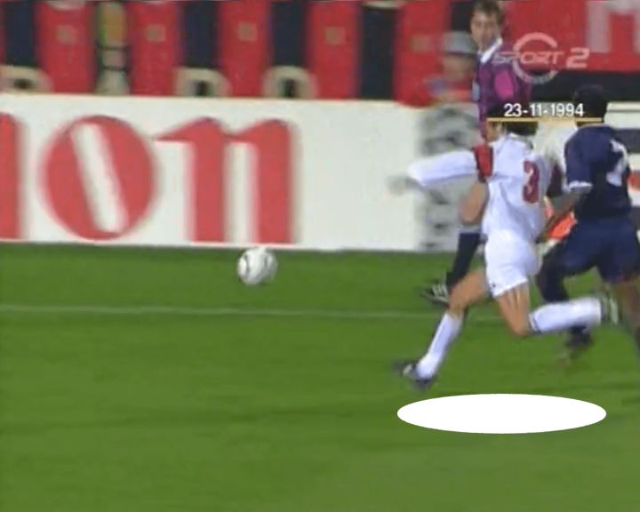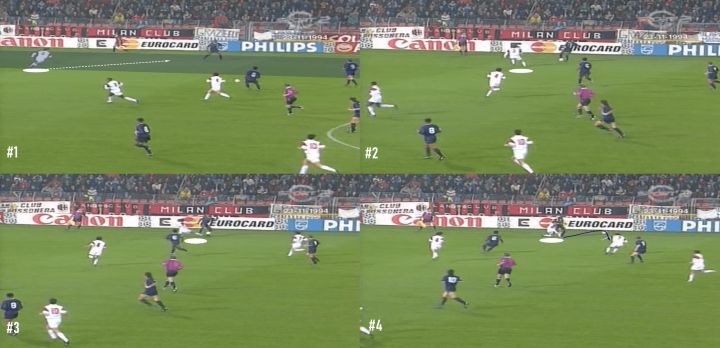 在继续下去之前,要先说明一下接下来图中下方高亮的球员便是马尔蒂尼。由于这些都是经典比赛,因此清晰度会有所欠缺。尽管我们已经选择了所能获得较高的分辨率和更广的战术视角。不幸的是,分析中并没有马尔蒂尼对阵马拉多纳的比赛。通过视频观看他们两的对决比通过静止图片观看要好得多。