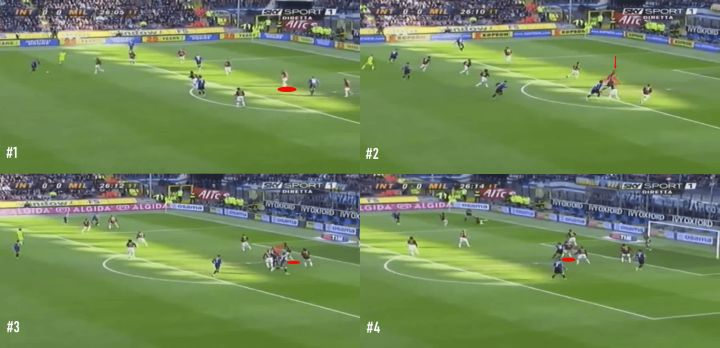 上图显示了两个马尔蒂尼保护身后空间的例子。前两张照片显示了他在对阵尤文图斯的比赛中保护他的中后卫身后。当尤文图斯送出高球时,你可以看到马尔蒂尼已经跑回防守身后。尽管在速度上处于劣势,他还是领先于对手拿到球。