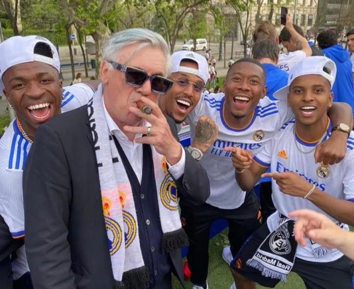 不止是本泽马,大部分皇马球员也对此有同样的感受。他们将安切洛蒂视作一位憨厚幽默的老大哥,一位可以倾诉的朋友,在西甲联赛的夺冠庆典上,他们特意为不抽烟的安切洛蒂,设计了一个戴墨镜抽雪茄的庆祝造型,最后由维尼修斯发向网络世界。