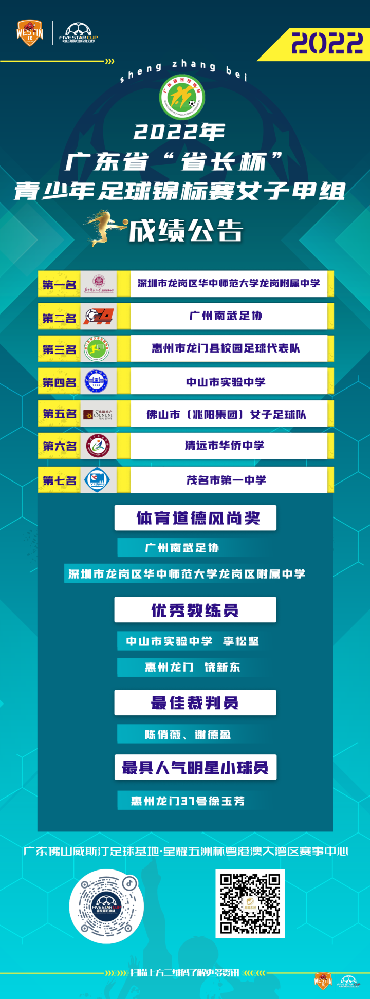 由广东省体育局、广东省教育厅主办,广东省足球协会承办,广东省体育彩票中心、佛山市威斯汀体育文化传播有限公司协办的2022年广东省“省长杯”青少年足球锦标赛女子甲组的比赛于5月29日在佛山威斯汀足球基地·星耀五洲杯粤港澳大湾区赛事中心落下帷幕。