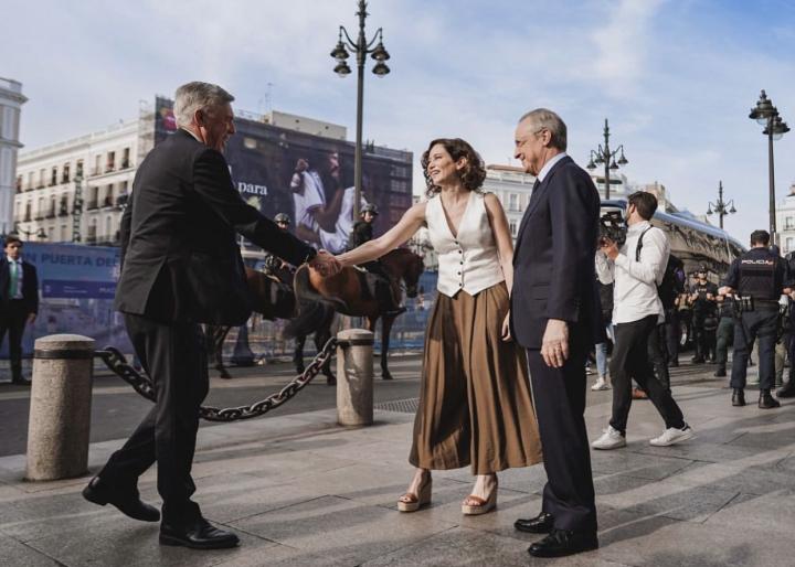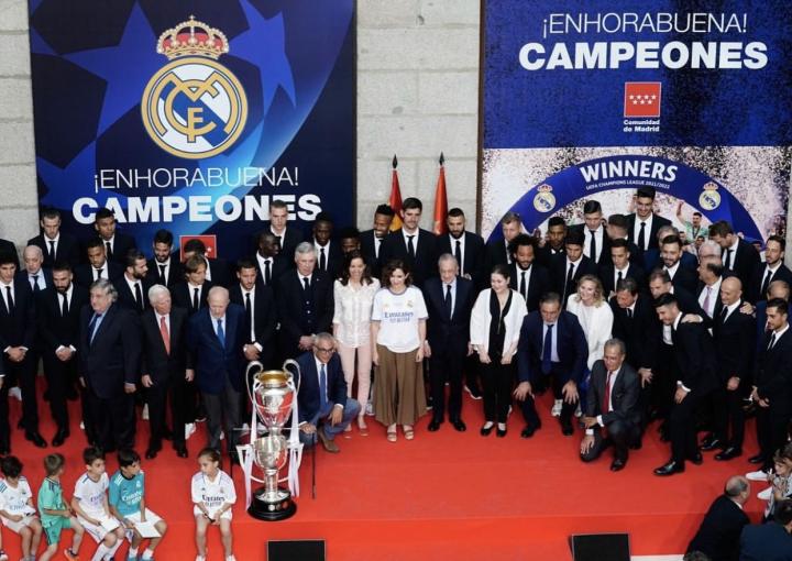 西班牙时间5月29日晚上,夺得第14座欧冠奖杯的皇马在马德里自治区政府大楼举行了夺冠庆典。皇马于晚上7点18分抵达马德里自治区政府总部,主席伊莎贝尔-迪亚斯-阿尤索作为主人在门前等待着皇马众将。