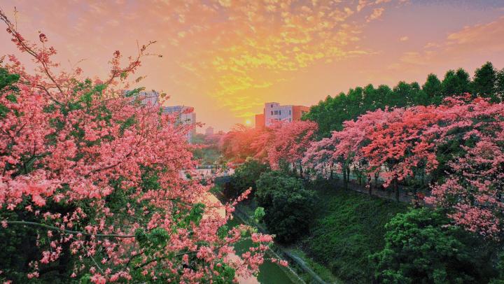每到冬天这里就会变成粉色的海洋,沿着流溪河岸盛开的丝木棉花,让许多游客驻足观望、也让那些曾在这里留下足迹的学子无比怀念母校。