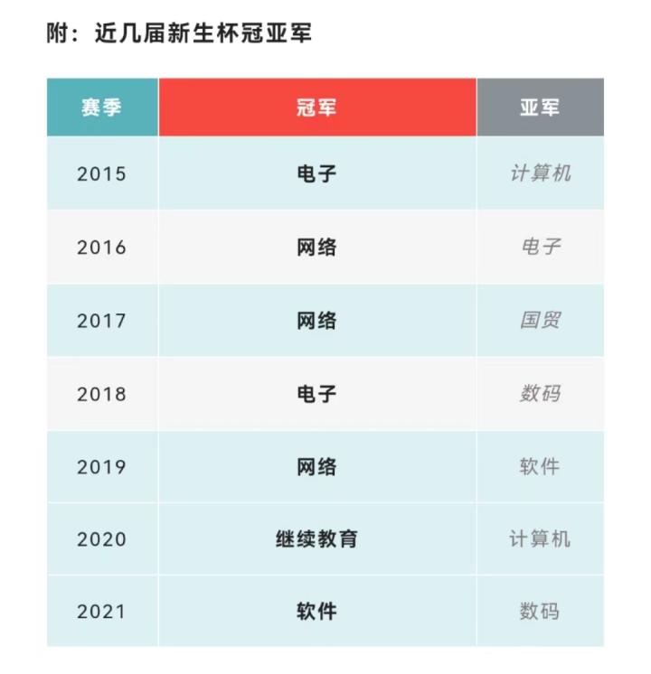 注:①财经系由国贸系和财会系在2021年合并而成;②外语系没有代表队,球员代表财经系比赛;③因目前双方人数都不足,继续教育学院代表队在2022年广软杯期间暂时和游戏系代表队进行合并,以游戏系名义作赛。