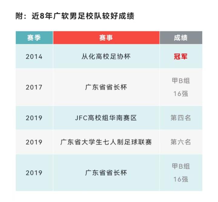 校队近5年最好成绩是2019年第四届兴业银行JFC青少年国际足球锦标赛高校组华南赛区的第四名。