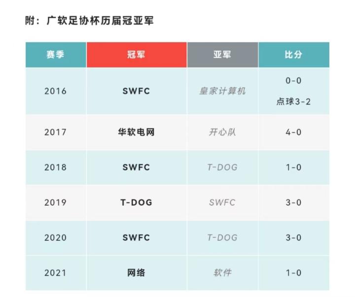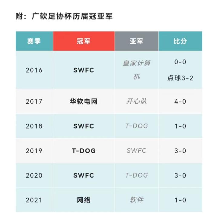 关于足协杯,值得一提的故事是T-DOG队和SWFC队(软件系)2018-2020连续三个赛季在决赛相遇,2018年SWFC1-0小胜T-DOG夺冠,2019年则是T-DOG3-0复仇对手,圆梦足协杯。2020年,经过人员变动的两支球队再次决赛相遇,SWFC3-0再胜T-DOG实现足协杯5年3冠1亚的骄人战绩。