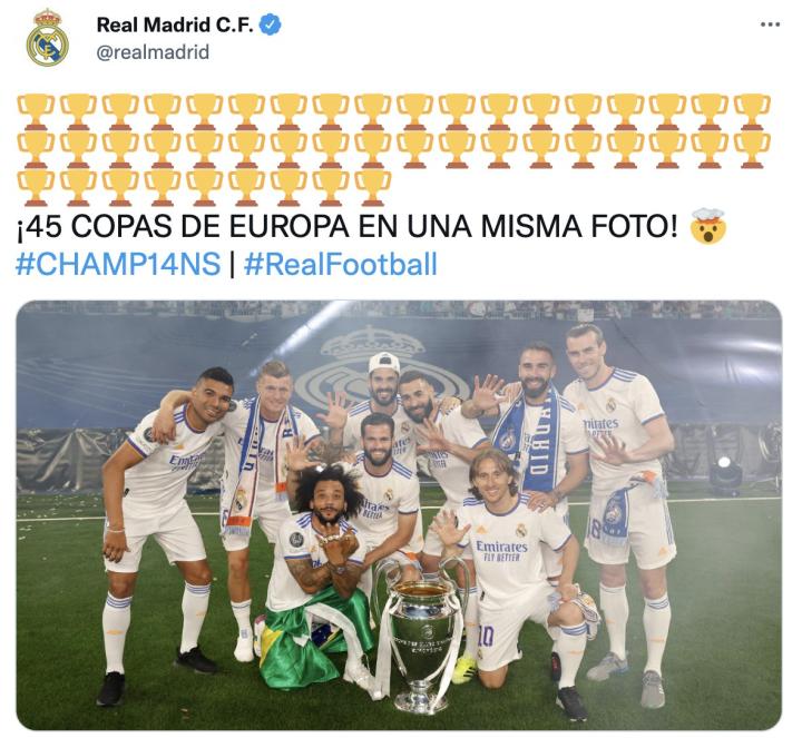 五九四十五,皇马官方晒九名欧冠五冠成员集体合影LaPulga @懂球帝2022-05-31 16:58皇马官方今日晒出了一张照片,九名五夺欧冠冠军的球员在夺冠庆典中一同合影留念。皇马在2014年、2016年、2017年、2018年和2022年拿到了欧冠冠军,其中卡塞米罗、克罗斯、伊斯科、本泽马、卡瓦哈尔、贝尔、马塞洛、纳乔和莫德里奇都是五冠的亲历者。皇马官方晒出了九名球员的合影,他们纷纷比出了五的手势,同时皇马官方也发了45个冠军奖杯的表情。商品货号:DQD2022UEFAMadridT展开更多