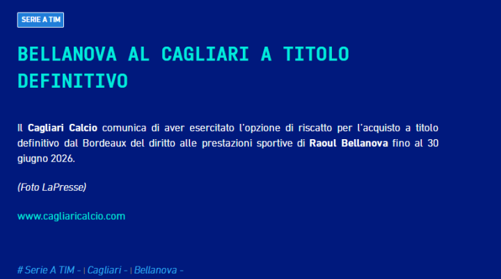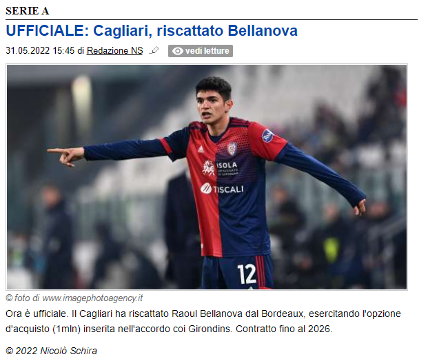 意甲卡利亚里俱乐部对外宣布,球队正式买断从法甲波尔多俱乐部租借而来的意大利人拉乌尔·贝拉诺瓦(Raoul Bellanova)。