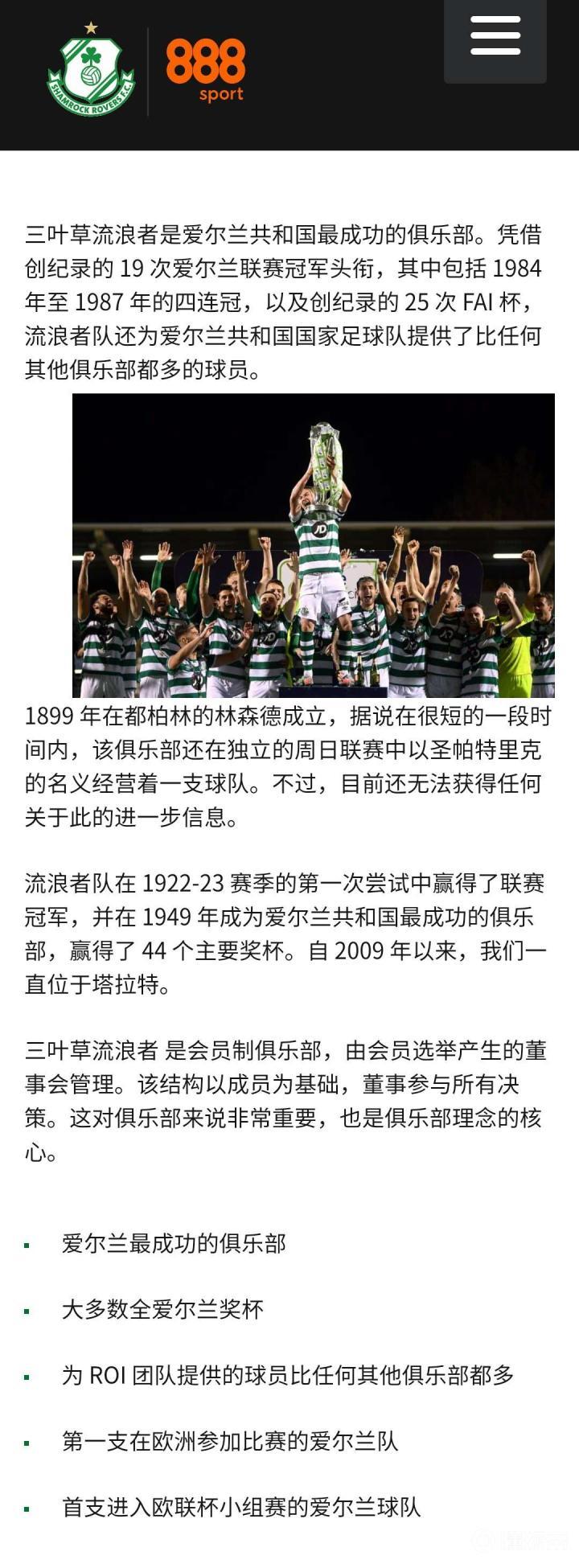 三叶草流浪者足球俱乐部(Shamrock Rovers FC) 三叶草流浪者足球俱乐部(爱尔兰语:Cumann Peile Ruagairí na Seamróige,英语:Shamrock Rovers Football Club),旧称“沙姆洛克流浪者”,是位于爱尔兰共和国首都都柏林的一家足球俱乐部,参加FAI爱超。俱乐部的徽章以足球及三叶草作为特色,这参考了俱乐部的名称,俱乐部名Seamróige在爱尔兰语中的意思是“三叶草”。 ==队名== 由于此前人们不知道其队名中的Shamrock是什么意思,所以之前只能暂时先音译为“沙姆洛克”,实际上“Shamrock”是爱尔兰语“Seamróige”的音译,意思是“三叶草”,而“三叶草”也是爱尔兰的国花。 ==历史== 多年来,关于三叶草流浪者足球俱乐部是成立于 1899 年还是 1901 年的激烈争论一直在进行。大多数证据都指向 1901 年。由于现代技术,人们已经确定最早提到该俱乐部的是 1899 年。研究仍在继续进入这个主题,以努力确定俱乐部诞生的确切时间。可以肯定的是, 三叶草流浪者 成立于 Ringsend; 俱乐部的名称来源于 三叶草 大道(Shamrock Avenue),而 三叶草 (Shamrock)也被作为是俱乐部徽章中的特色之一。委员会在那里有一个举办会议的设施。俱乐部在 1904/05 年赢得了都柏林郡联赛和伦斯特青年杯,第一次获得荣誉(当时是条纹球队)。次年获得了伦斯特青年联赛冠军和杯赛,但俱乐部在足球行列中的崛起可能太快了,他们被迫在 1906/07 赛季开始前退出伦斯特青年联赛。 1914 年,当他们赢得了伦斯特青年联赛和 IFA 青年杯时,俱乐部又迎来了第二次到来。他们在伦斯特高级联赛中成功完成了 1915/16 赛季,但在那个赛季结束时再次退出。