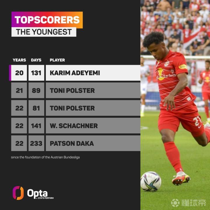 据Opta统计,阿德耶米以20岁零131天的年龄超越了奥地利维也纳传奇托尼-波尔斯特于1984-85赛季创造的纪录,成为奥超联赛史上最年轻的金靴得主。