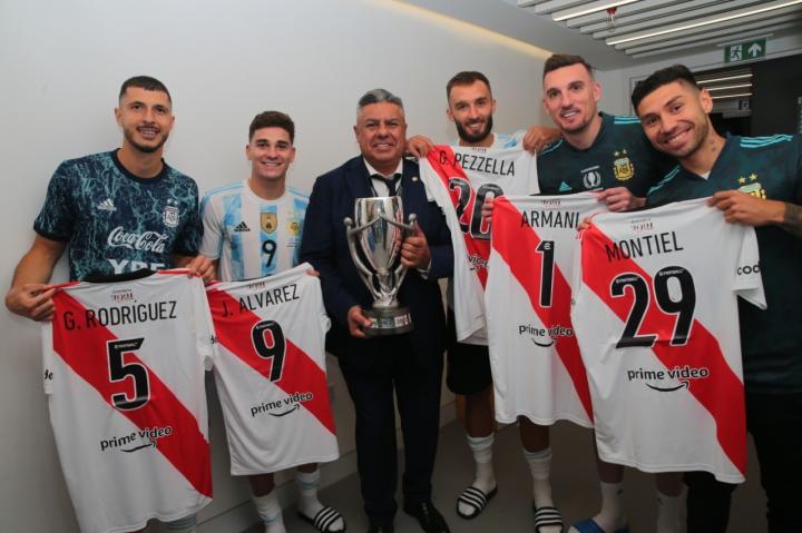 河床出品,河床官方晒6名阿根廷国脚举着河床球衣照片ETChalmers @懂球帝2022-06-02 11:32在阿根廷与意大利赛后,河床官方晒出6名阿根廷国脚在温布利球场举着河床球衣的照片,6人都是正效力或效力过河床的球员。中间捧着奖杯的则是阿根廷足协主席塔皮亚。其中胡利安-阿尔瓦雷斯和阿尔马尼目前正效力于河床,前者以租借的方式效力球队,即将正式加盟曼城。而吉多-罗德里格斯、佩塞利亚、蒙铁尔和帕拉西奥斯都是曾经出自河床青训的球员。展开更多