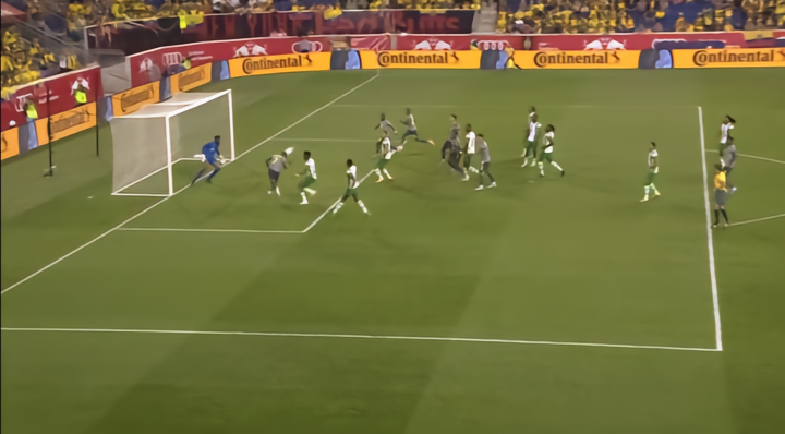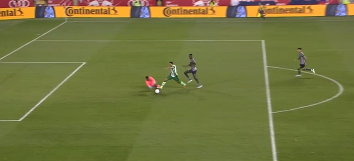 第90分钟,摩西斯·西蒙的凌空抽射踢跐,眼看丹尼斯就要补射,门将亚历山大·多明格斯抢在他之前把球打出底线!