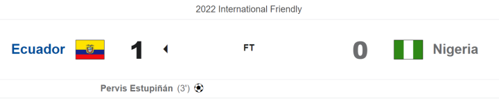 最终,凭借埃斯图皮尼安的开场头球闪击破门,厄瓜多尔主场1:0战胜尼日利亚。