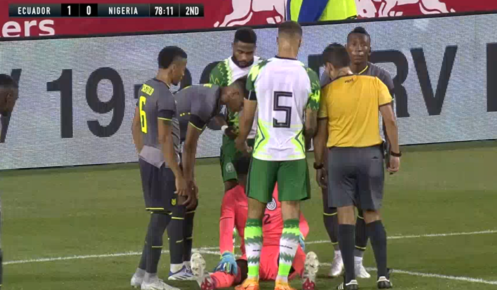 第78分钟,在尼日利亚定位球进攻中,厄瓜多尔门将亚历山大·多明格斯落地时踩到了本方2号埃纳的脚,痛苦倒地。但随后他缓了过来,可以继续比赛。