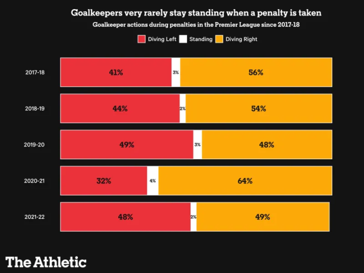最近几个赛季的英超联赛,守门员防点球原地不动的比率只有3%,扑右侧(射门队员左侧)是55%,扑左侧是42%。