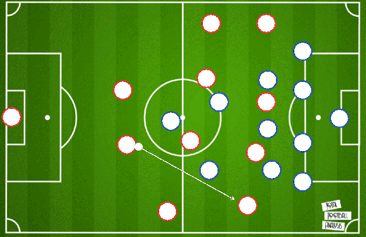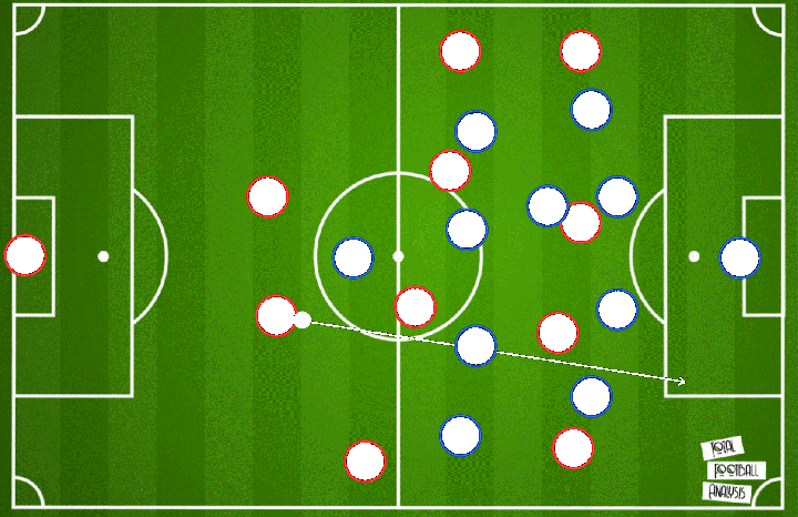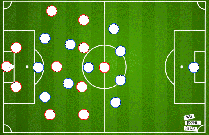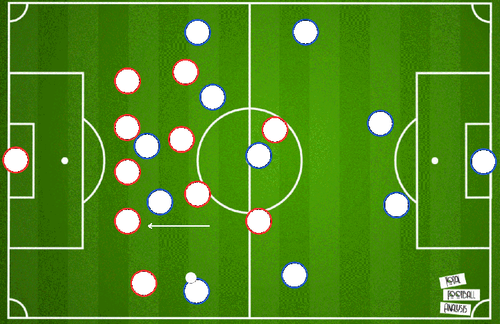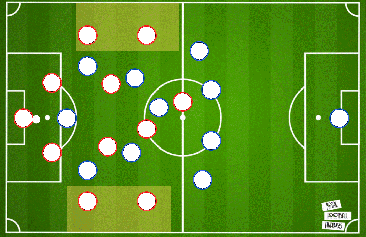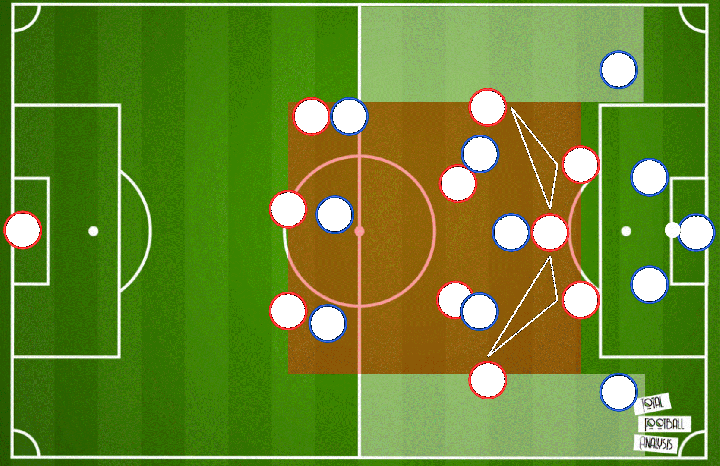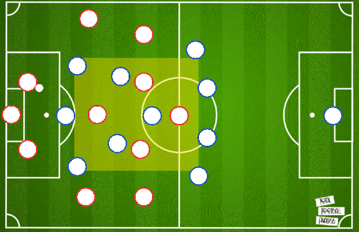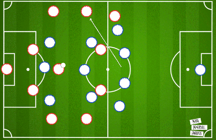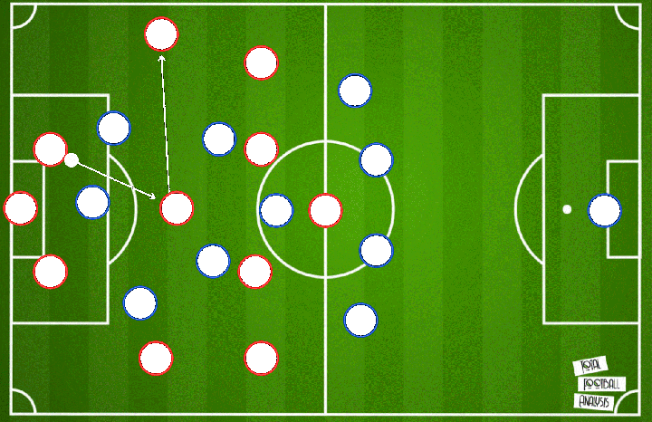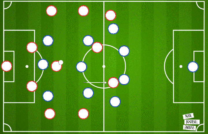 这个战术背后的想法是在中场制造大量的掩护,同时也让三名球员立刻准备好接近对方边后卫身后的空档。这使得两名中后卫和蒂尔尼组成的后防三人组要负责处理所有的过顶球。