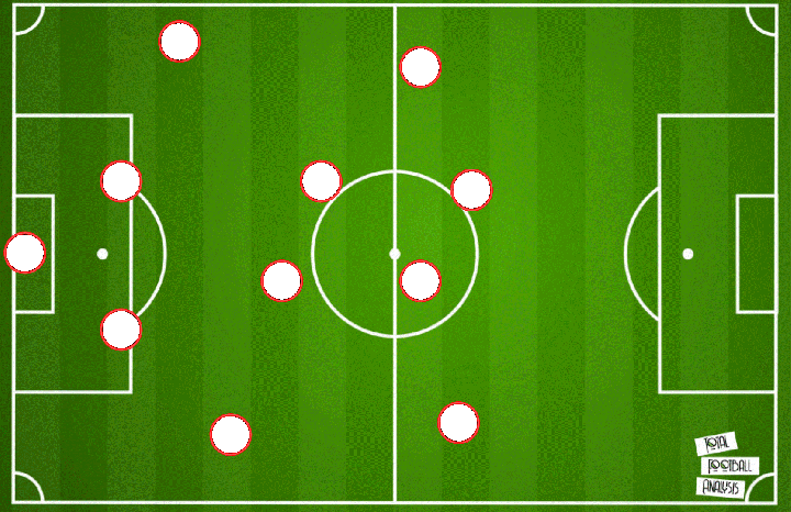 有时,阿森纳的阵型更像是4-3-1-2,拉卡泽特作为伪9号,边锋保持高位压迫并且充分拉边,阵型甚至会更倾向于是4-2-4,正如我们从他们最近比赛的平均位置中观察到的那样。