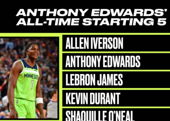 在季后赛争夺中,爱德华兹也屡屡挺身而出,尝试拯救球队。最近,爱德华兹受邀选出自己心中的历史最佳阵容,他在得分后卫的位置上放了自己,而不是迈克尔-乔丹。不得不说,这是一个大胆的选择,证明爱德华兹目前信心爆棚,相信自己未来能够成为比肩乔丹的超级球星。