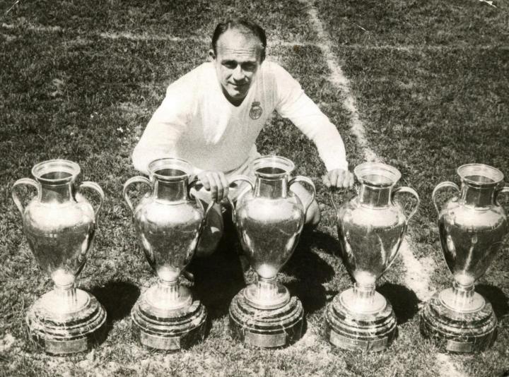 排名第5的我认为是皇马曾经的“金箭头”迪斯蒂法诺,他算是单独的一档,属于比上不足比下有余。在河床年少成名的迪斯蒂法诺,他是河床传奇的机器五人组的接班人,而且早在1947年就率领阿根廷获得了美洲杯冠军,自己也荣膺金靴,只不过他后来因为钱去哥伦比亚淘金暂时沉寂了一段时间。之后他在皇马的职业生涯,大家都比较熟悉了,他一跃成为了二战之后的第一代球王,率领皇马拿下欧冠五连冠,并且这五场欧冠决赛都有进球。他对于球队的作用,相信知道皇马历史的美凌格都很清楚。但是从综合影响力和球技来看,我认为他是没办法和梅罗比肩的。不过比起下面两位呢,那还是绰绰有余的。