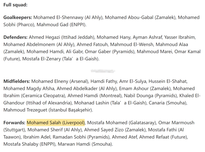 在这份大名单中,在欧洲联赛效力的只有5人,萨拉赫、埃尔内尼、马尔穆什在五大联赛闯荡。后防线上,除了赫加齐效力于沙特联赛,其余人员全部来自埃及本国联赛。