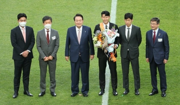 在6月2日与巴西队的热身赛赛前,韩国总统尹锡悦前往赛场向韩国队的7号孙兴慜颁发了青龙体育勋章(以下简称“青龙奖章”),这也是韩国体育界人士的最高荣誉。现年30岁的孙兴慜在2021-22赛季的英超联赛中,夺得英超金靴,成为了亚洲足球历史上第一位拿到五大联赛金靴的球员。“青龙勋章”是韩国体育勋章等级最高的勋章,1973年,韩国颁布了《体育人员授勋法》,规定凡是在奥运会、世锦赛、亚运会等大型体育赛事拿到奖牌的运动员、教练员以及相关官员,都会获得相关勋章