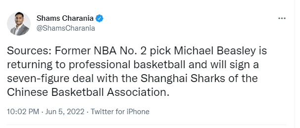 壹个球迷的自我修养据美国名记Shams报道,迈克比斯利将重返CBA,与前东家上海男篮签下一份百万美元级别的合同。