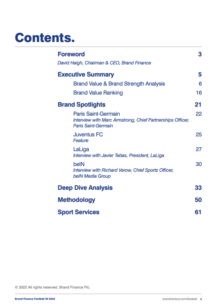 足球行业最有价值和最强的50个品牌会被列入每年的Brand Finance Football 50排名中。该估值由专业会计师按照ISO品牌估值标准生成,估算出的品牌价值是基于品牌所有者在公开市场上授权使用该品牌所能获得的净经济收益。