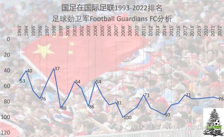 中国男足在FIFA男足国家队排名中,在过去30年里平均第73名。目前,为第77(下图)。