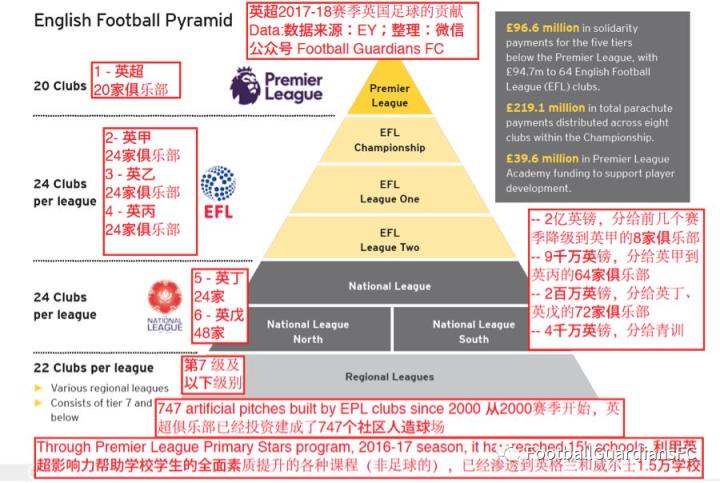 作者曾分享过,与小球和我国传统奥运金牌项目不同,足球是聚沙成塔的项目。没有参与人口的大基础和密集(各地方的联赛),就没有国家队和职业足球的辉煌(上图:英格兰足球金字塔)。