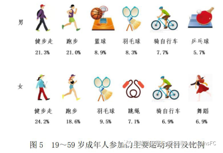 国人的运动情况,在所有的调查中,最官方、调研面最广的,当推国家体育总局的《2020全民健身活动状况调查报告》。其报告披露,在19-59岁人群中(含大学生),足球肯定不是男女参加的运动前六名,确定输给篮球。能否有5%参与,都得打个大问号(下图)。
