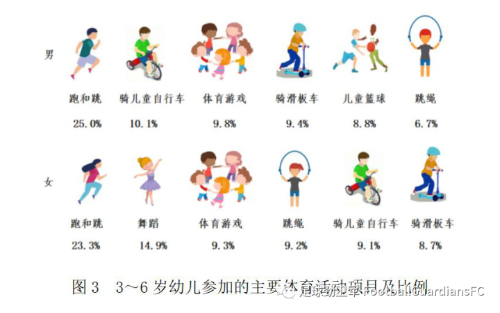 将学校体育课、课外体育、校外体育全部都包括在内,不管是幼儿园、还是小学、中学和高中年龄段,足球同样在前六名以外。不仅全面输给篮球,是否有5%的参与率,都需打个问号(上面3-6岁和下面7-18岁图)。